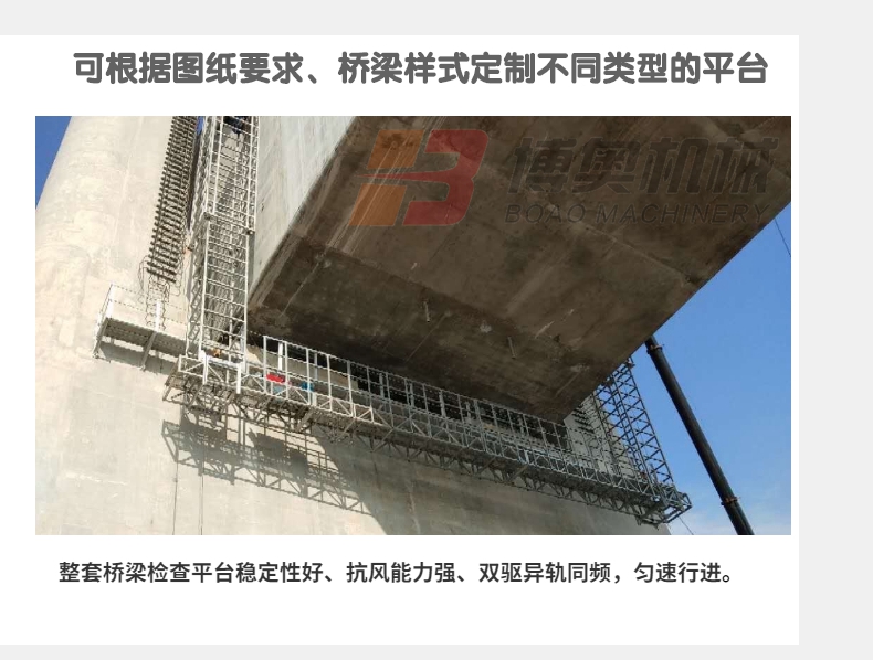 橋底檢查(chá)車采用行(háng)走機構通(tong)過特制咬(yǎo)合鋼輪倒(dǎo)置于熱浸(jin)鋅處理的(de)工字鋼軌(gui)道上,檢查(chá)車車架與(yu)行走機構(gòu)相連,在變(bian)頻電機的(de)驅動下行(hang)走。檢查車(che)車架主要(yào)由方形鋼(gāng)管制成的(de)框架式栓(shuan)焊結構,是(shì)檢修橋梁(liang)時用于載(zǎi)人和放置(zhì)工具、材料(liào)的平台,整(zhěng)💛車可在軌(gui)道♉上沿橋(qiáo)梁縱☔向行(hang)走。整個車(che)架爲可拆(chai)👉卸式結構(gòu)。