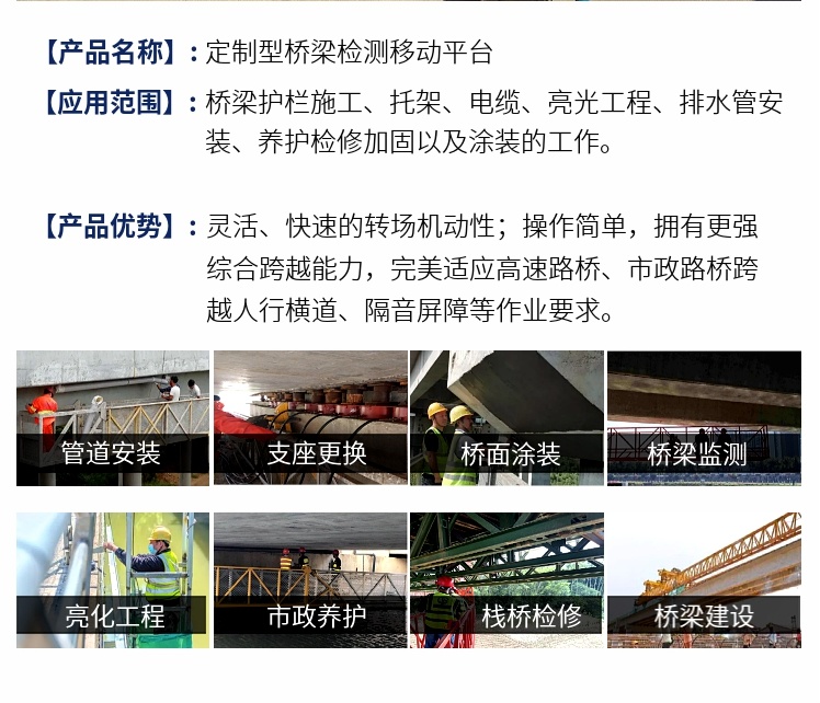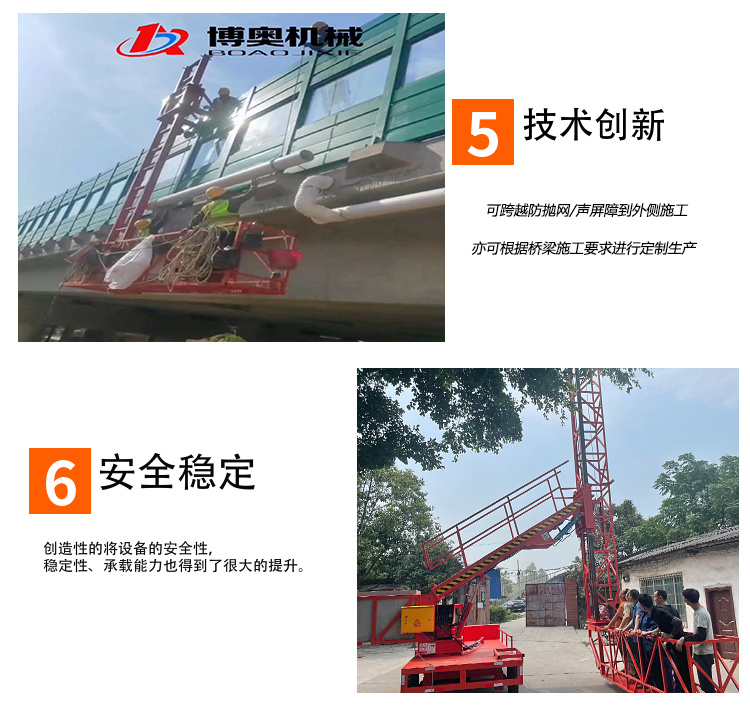 它可(kě)的優勢是可以跨(kuà)越人行道、防抛網(wǎng)、聲屏障等障礙物(wù)伸到橋梁側面施(shi)工。