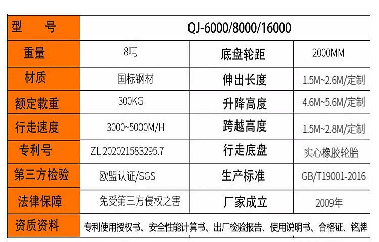 升降高度可達:5~6米(mǐ);實心輪胎配置底(dǐ)盤;自帶配重;