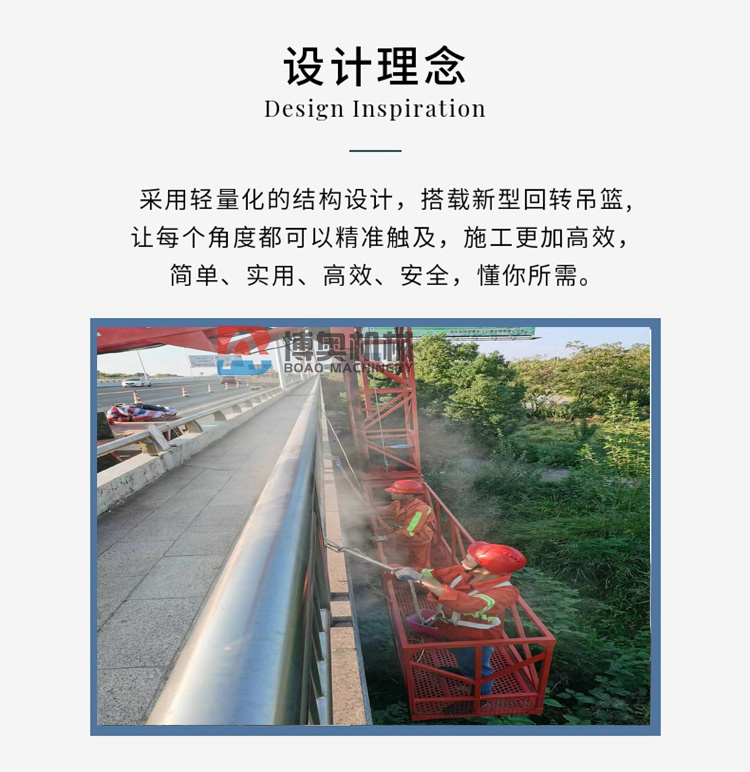 橋梁落水管(guǎn)安裝施工設備(bèi)設置有配重平(píng)台,通過👉配重平(ping)台保持整個裝(zhuāng)置的平衡,确保(bao)施工安全,台車(che)系統整體平穩(wen)靈活移動,并裝(zhuang)備了智能電路(lù)控制系統,能夠(gòu)實🐕現靈活的操(cāo)控和全方位安(an)全限制和保護(hù),加強台車整體(ti)穩定性。轉移靈(líng)活☔、效率高,且經(jīng)濟适用、成本低(dī),施工安全性高(gāo)。