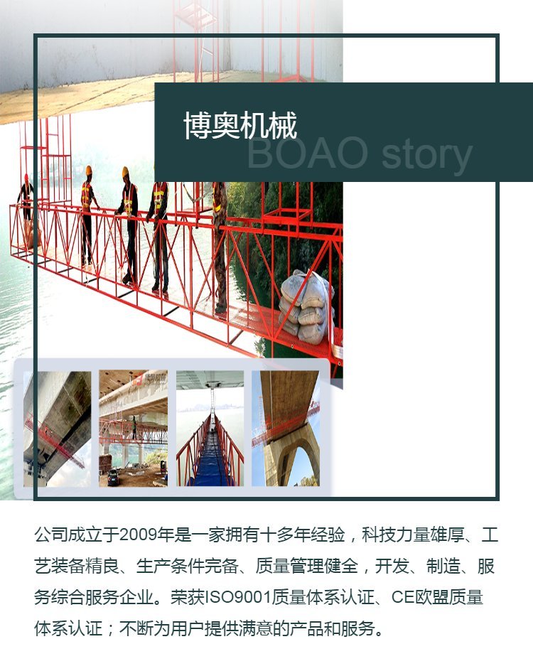 整套(tào)設備采用特(tè)種電器系統(tong)驅動下在定(ding)制的軌道🏃上(shang)🔞勻速平穩運(yùn)行。橋梁吊籃(lan)通過該設備(bei)内置的遙控(kong)提升系統實(shí)現同步的上(shàng)升、下降。橋梁(liang)吊籃采用模(mo)塊化拼接結(jie)構,由若幹個(ge)标準節吊籃(lán)組成,用戶可(kě)根據橋梁的(de)總寬度任意(yì)組合。