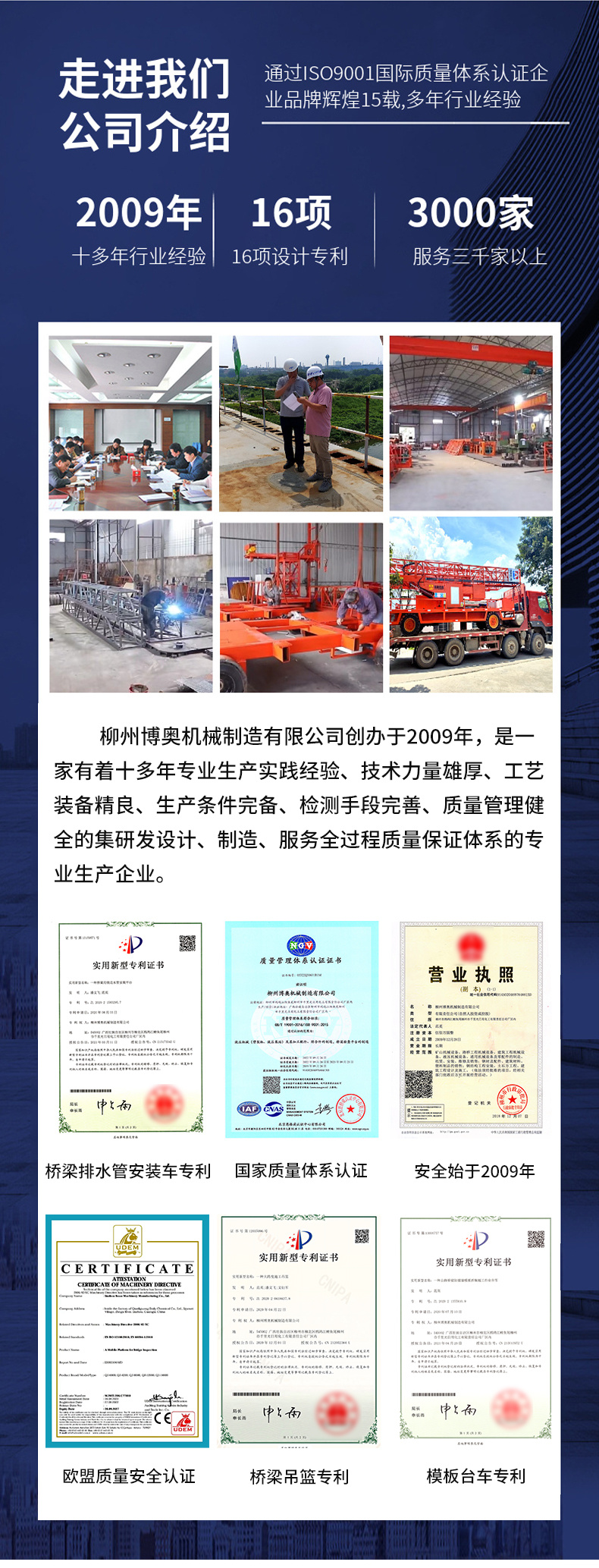 公司長達十(shi)多年的研發(fā)制造,憑借先(xian)進的設計理(li)🌂念和實踐🔞經(jīng)驗,所生産産(chan)品率先獲得(de)了橋梁檢查(chá)🙇♀️平台國家質(zhì)量管理體系(xì)認證證書:GB/T19001-2015/ISO9001,中(zhong)國認可,國際(jì)互認;3A級企業(ye)信譽等級證(zhèng)書,大跨度施(shī)工吊籃發明(ming)專利,專利号(hao):202020618637.8,穩定支撐架(jià)吊籃🌈專利号(hao):202022031334.9,公路橋梁防(fang)撞牆模闆拆(chāi)裝施工作業(yè)台車:202021355910.9,橋梁🐆側(ce)邊水管安裝(zhuang)平台:202021583295.7,廣西重(zhòng)點扶持型機(ji)械制造企業(yè),企業集生産(chan)設計研發生(sheng)産銷售一體(ti),數十年專業(ye)研發生産橋(qiao)梁檢修設備(bei),是廣西橋梁(liáng)檢查車大跨(kua)度資質生産(chǎn)廠家,橋隧施(shi)工系列設備(bei)齊全的供應(yīng)商。