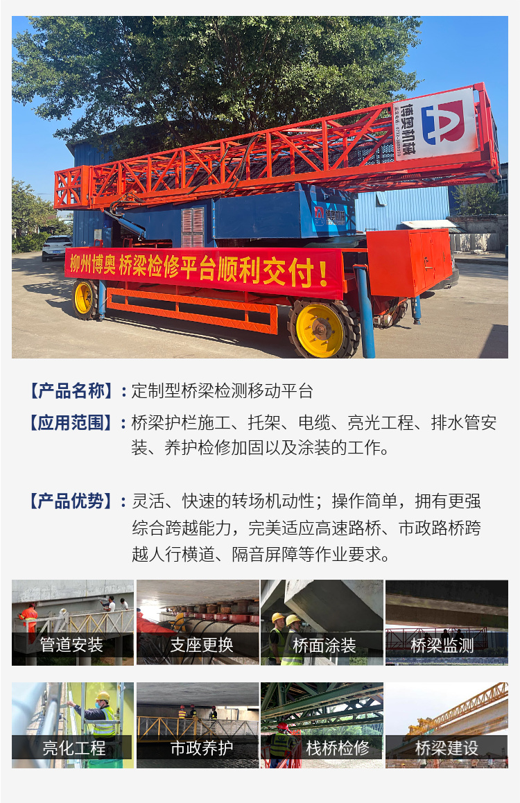 新(xīn)型BAQJ13M橋梁檢測(cè)移動平台具(ju)備安全、可靠(kao)、易操作、輕量(liang)🚶化等🌏特點,能(néng)夠滿足橋梁(liang)養護施工需(xu)求。它采用主(zhǔ)動力直聯驅(qū)🤩動形式,力量(liàng)強勁;且爬坡(pō)更輕松。設💋備(bèi)的行走輪胎(tai)則采用🚩實心(xin)灌注橡膠型(xing),适應性特強(qiáng);它還采用智(zhi)能變頻調速(sù),轉場速度更(gèng)快,靈活自✍️如(rú)應對道路不(bu)平或伸縮縫(feng)打滑路況。